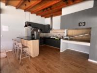 Isla central con barra y terminaciones contemporáneas que aportan calidez.